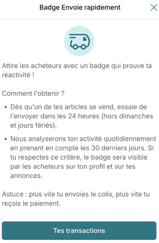 Pour stimuler l’activité des vendeurs, Vinted introduit de nouveaux badges : « Envoie rapidement », « Dressing au Top », etc. Ces récompenses encouragent les vendeurs à agir vite, bien, et souvent. Le but : augmenter le flux des nouveaux objets sur le marché, donc améliorer la fidélité des acheteurs.