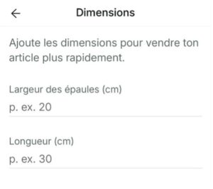 Vinted va plus loin dans la structuration des annonces : les vendeurs sont encouragés à indiquer systématiquement les mesures (longueur, tour de taille, manches, etc.) et la composition des textiles.