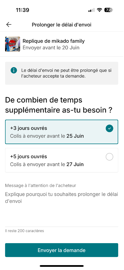 Certaines contraintes logistiques — retards, congés, imprévus — rendent les délais standard peu réalistes pour certains vendeurs. Pour y remédier, Vinted teste des options de délai plus souple, destinées à protéger les vendeurs et à limiter les annulations d’acheteurs anxieux d’une évaluation négative.